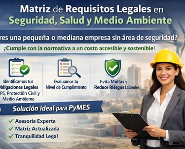 Identificamos las obligaciones legales que aplican a tu centro de trabajo en materia de STPS, Protección Civil y Medio Ambiente, evaluamos tu nivel de cumplimiento y te entregamos una matriz clara, actualizada y priorizada, que te permitirá reducir riesgos, prevenir sanciones y tomar decisiones informadas, sin necesidad de contratar personal especializado de tiempo completo.